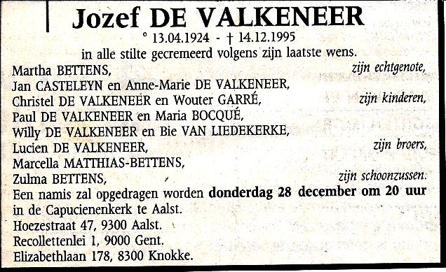 Jozef Adhemar Leo De Valkeneer overlijden