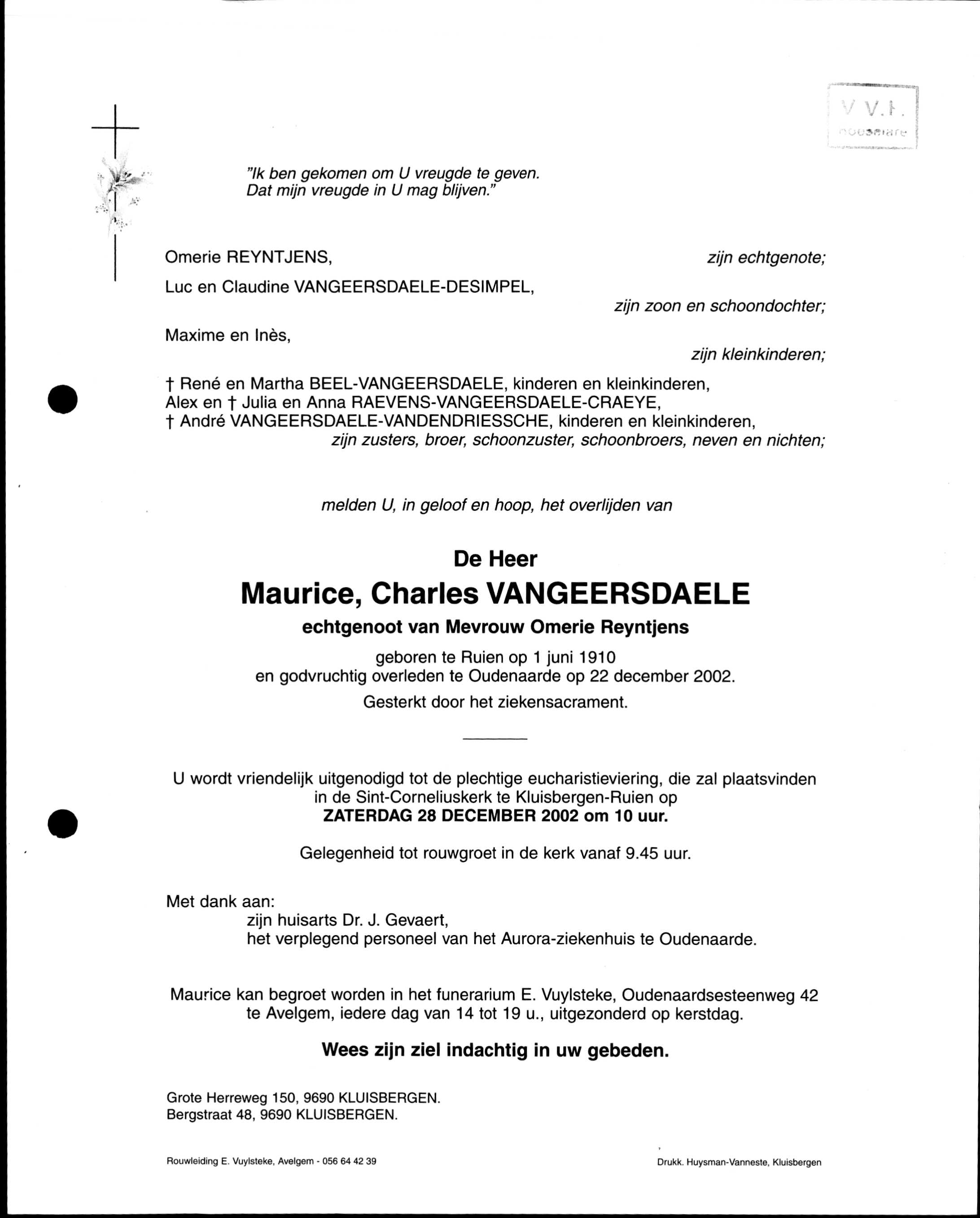 Maurice Vangeeersdaele overlijden