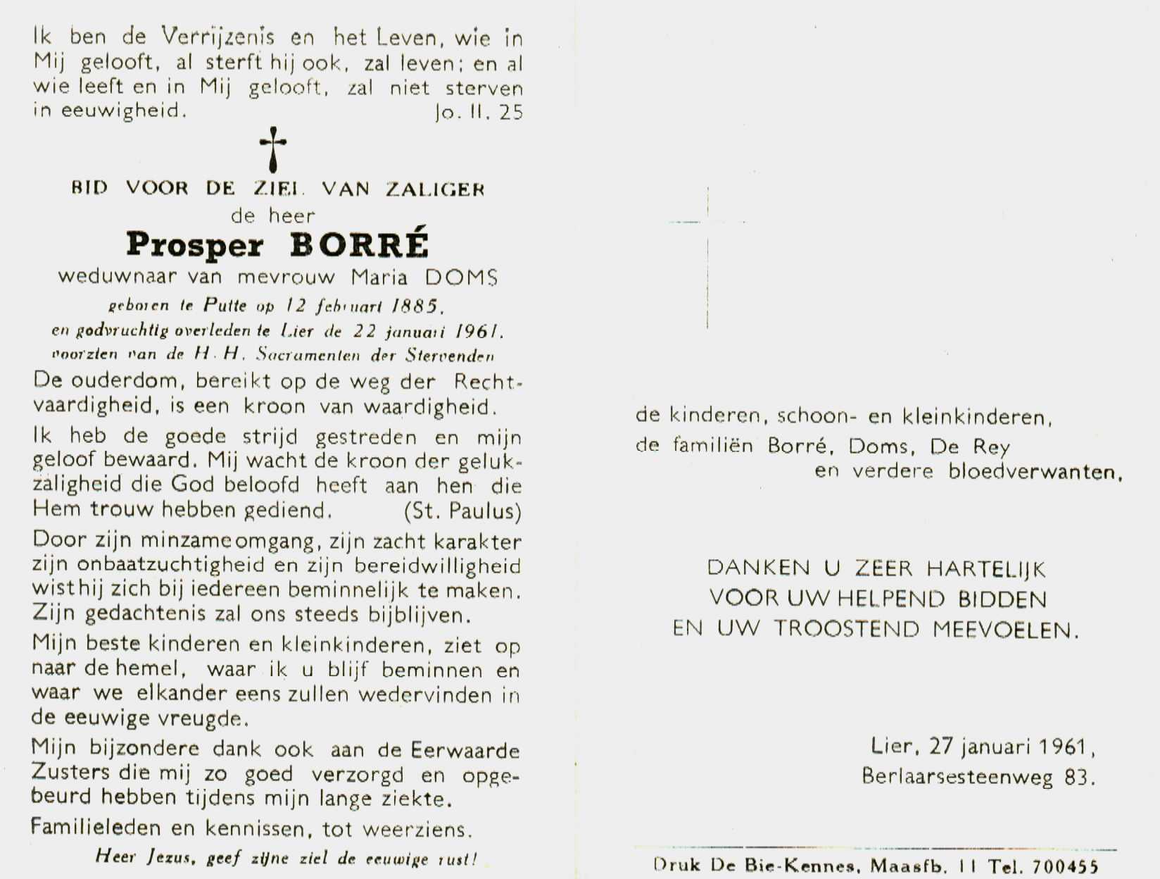 Partner | Maria Louisa DomsMaria Louisa Doms ![]() * 15-12-1882 Mechelen † 05-07-1917 Putte ∞ Guillielmus Prosper Josephus (Willem Prosper Jozef) Borré, 3 kinderen |