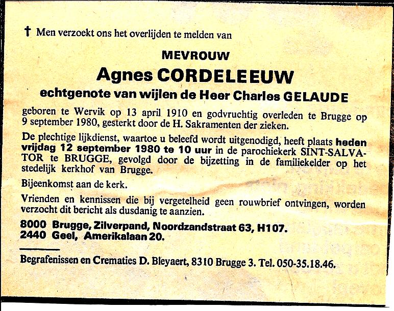 Agnes Paula Marie Louise Cordeleeuw overlijden